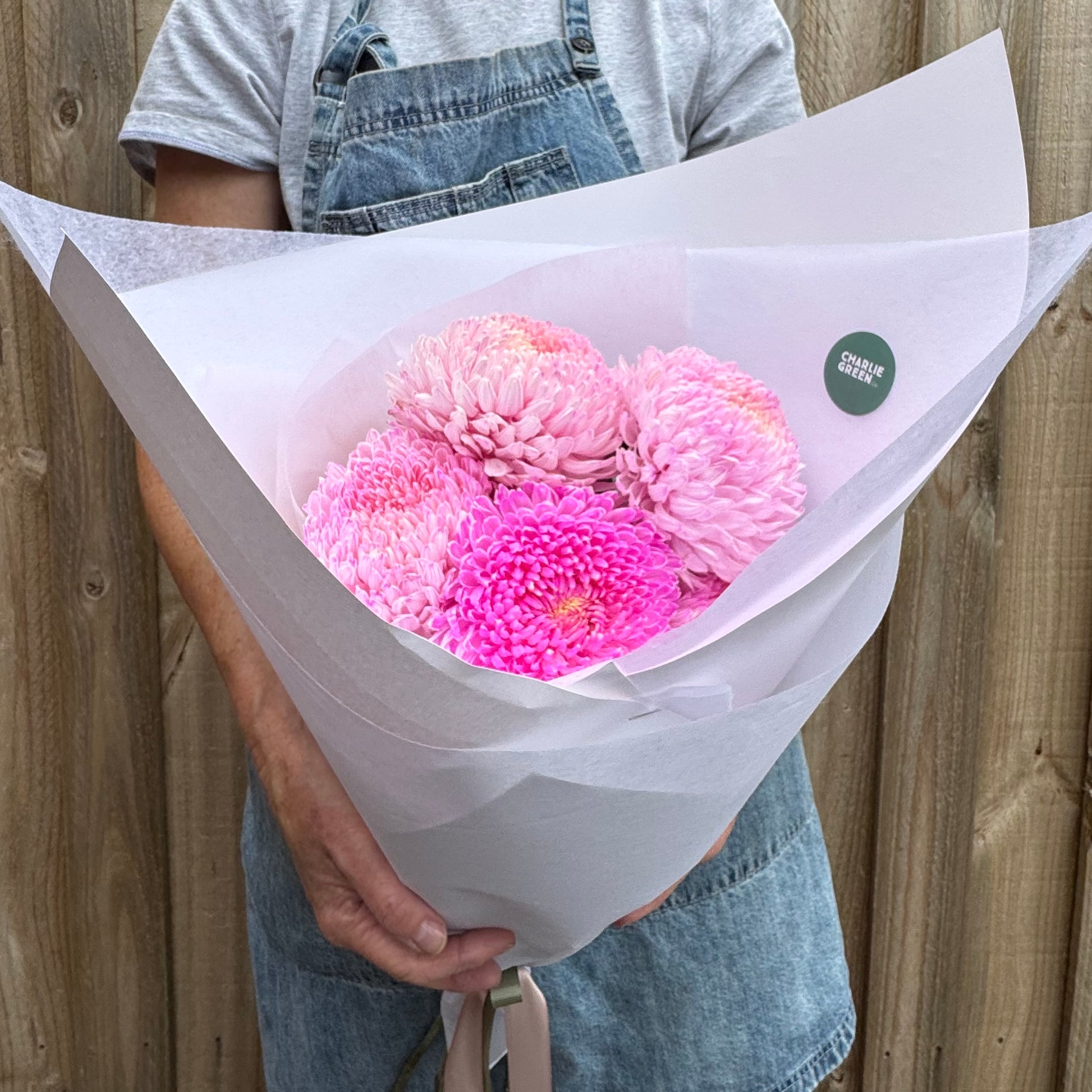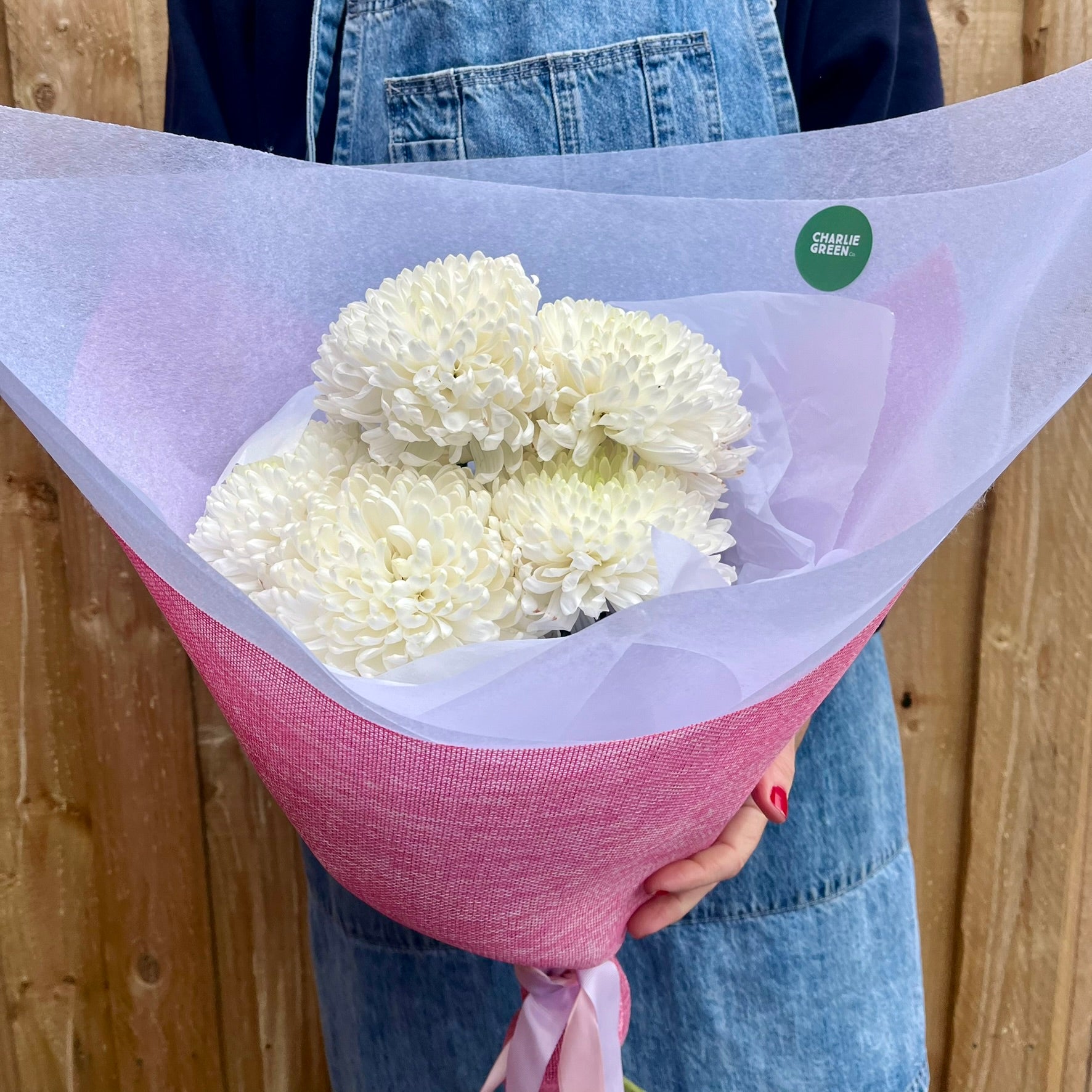 Soft, full, and absolutely dreamy! This gorgeous bunch features big, fluffy disbuds in your choice of white or pink. Beautifully wrapped and finished with a statement ribbon, it's the perfect pick for any occasion.